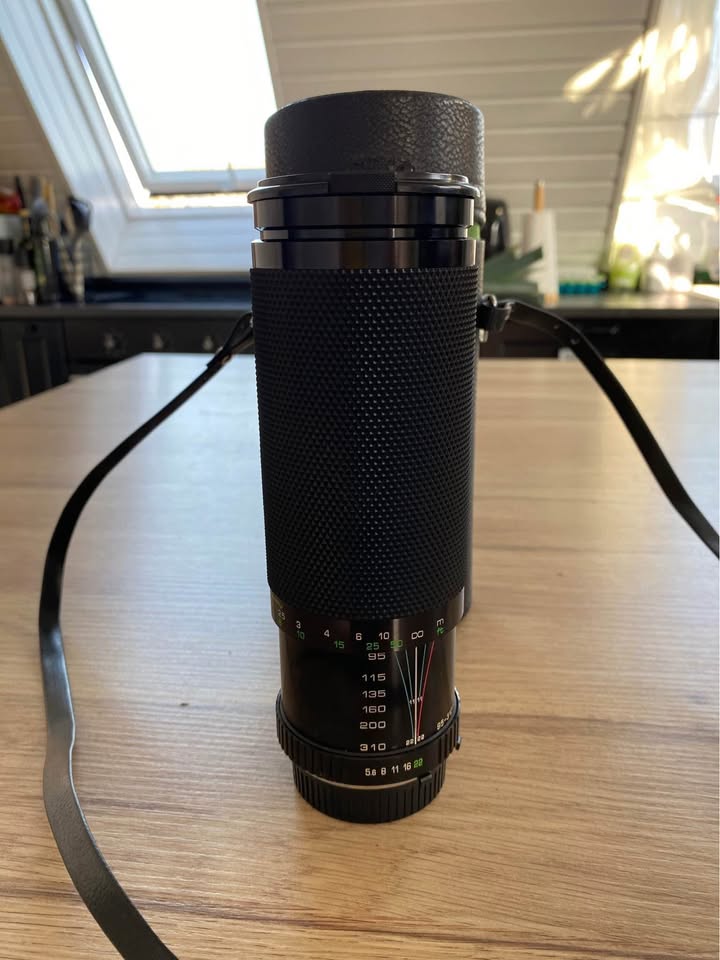 Objectif de la marque Soligor 95-310mm faisant zoom + macro. Ouverture F5.6.